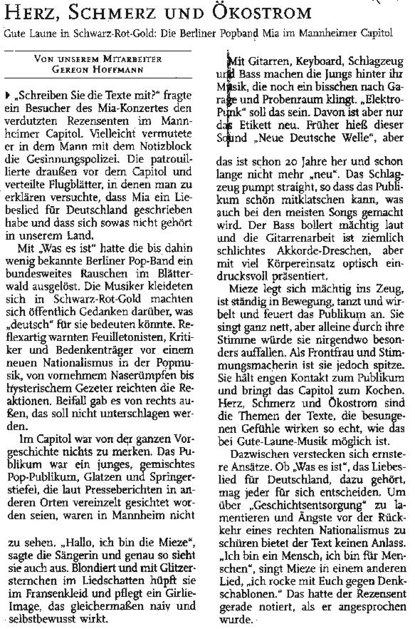 MIA-Konzertes einen Artikel abgedruckt, in dem auch das Flugblatt